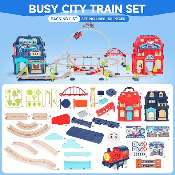 Delight your little one with this Train Track Set for Kids – a complete 131-piece loop track playset that offers hours of imaginative fun. This interactive toy set includes a battery-powered train engine, colorful tracks, railway bridges, and decorative items like trees and traffic signs to build an exciting miniature railway world.