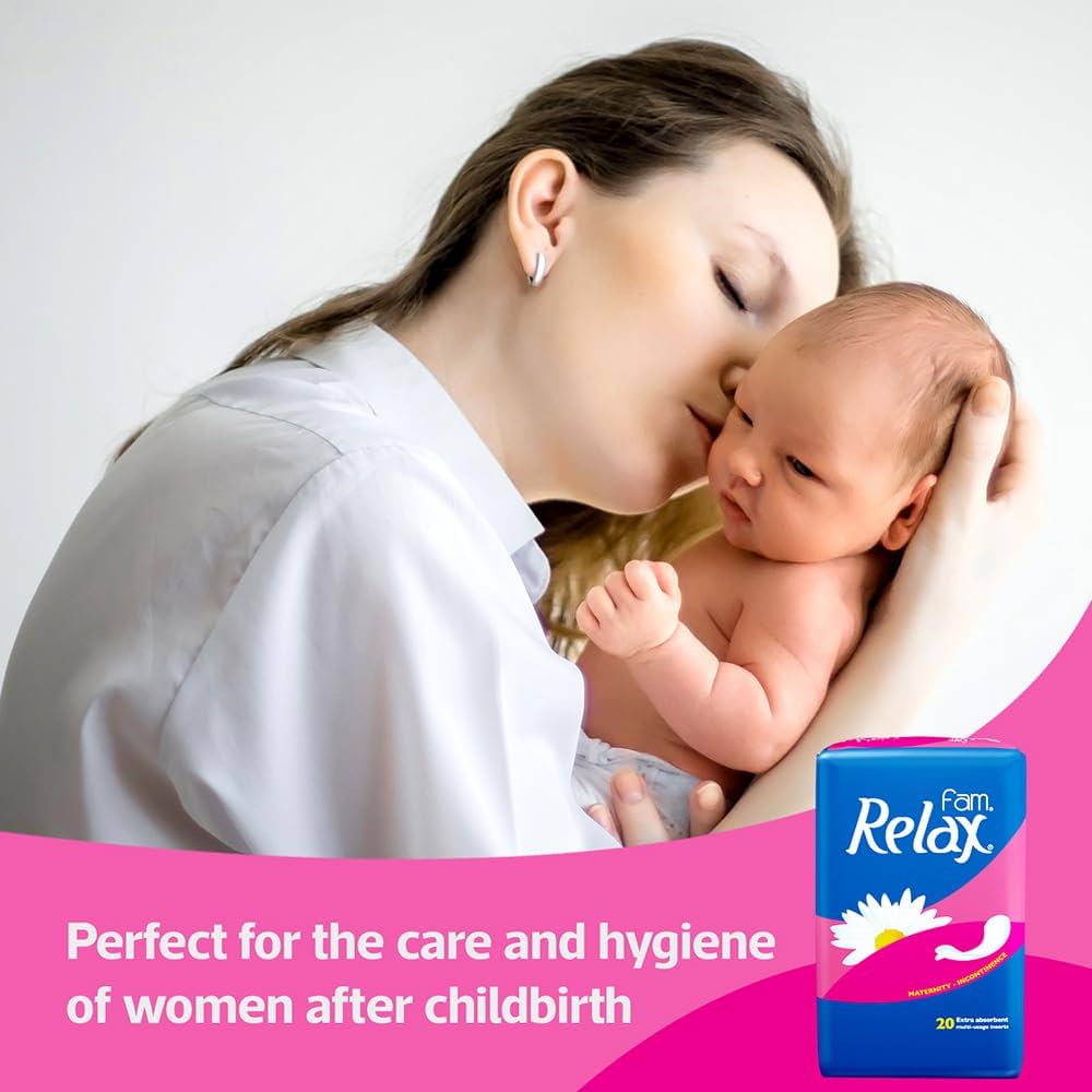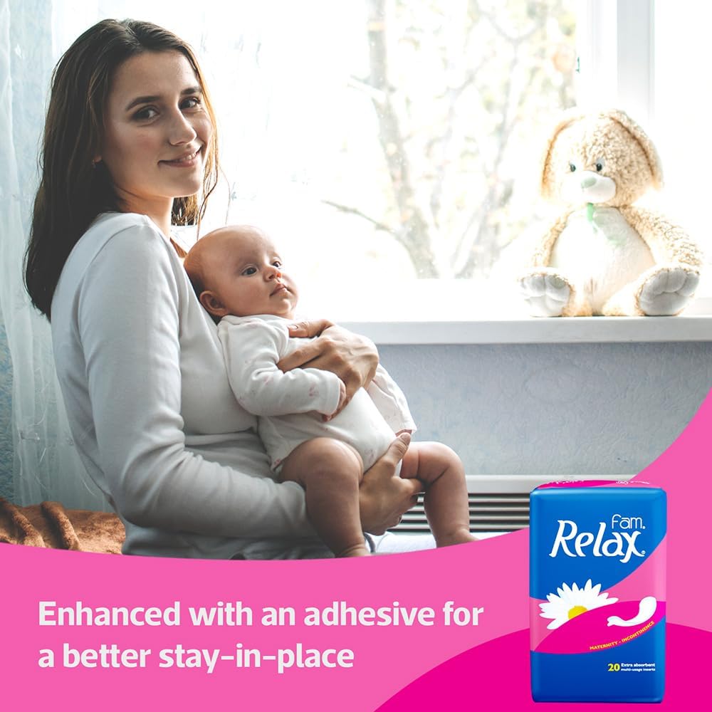 Fam Relax maternity pads are designed for postpartum bleeding, offering high absorbency and a comfortable, secure fit. They are longer and thicker than standard sanitary pads, with an adhesive strip for better placement. Reviews suggest they are a good option for postpartum hygiene and comfort.