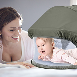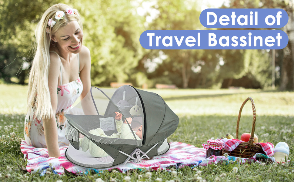 The Portable baby bassinet travel bed, often also described as a travel pod or lounger, is a lightweight, foldable, and easily transportable sleeping solution for infants. These bassinets typically include features like a mosquito net, sunshade canopy, and washable fabrics, making them suitable for both indoor and outdoor use. They are designed to provide a safe and comfortable sleeping space for babies while traveling or on the go.