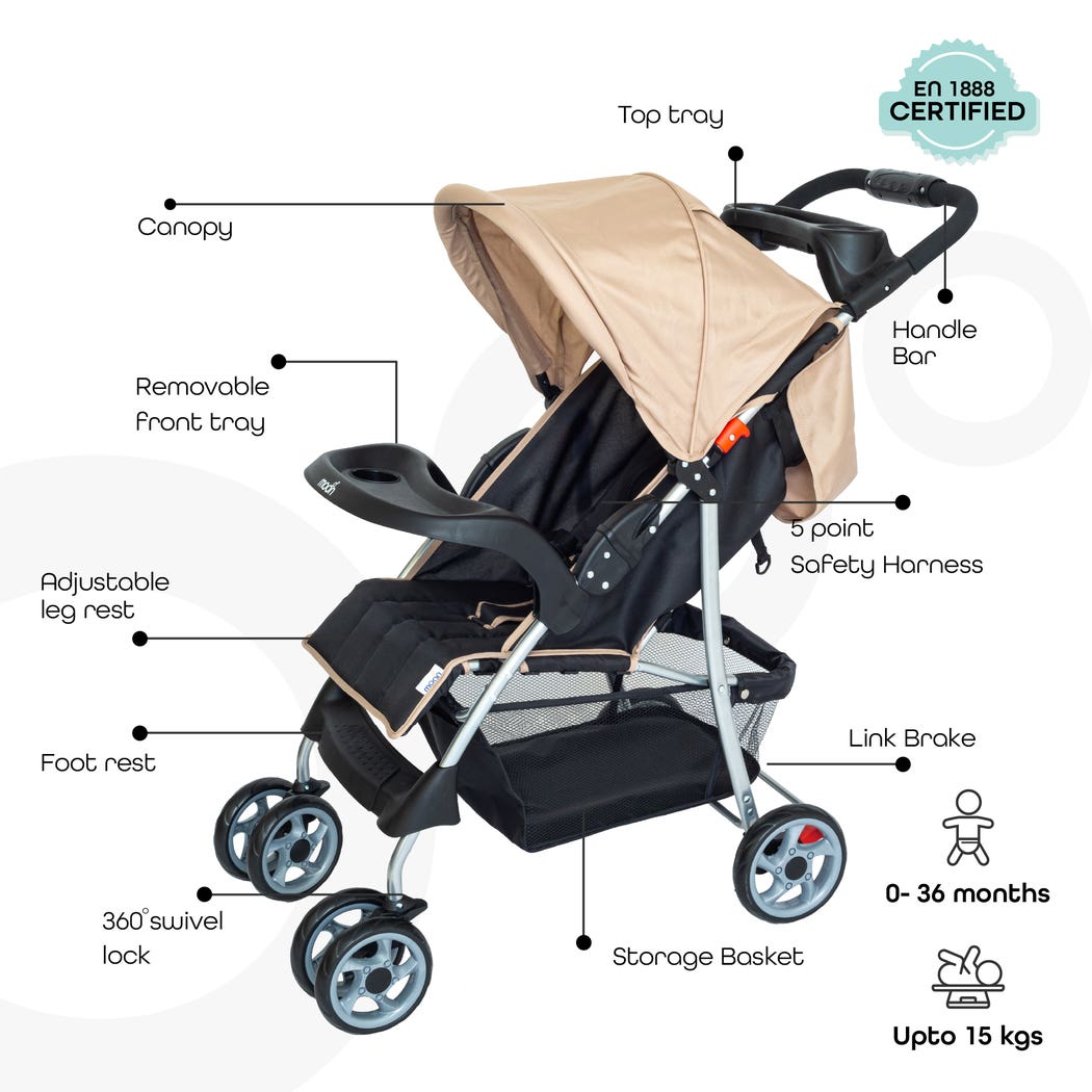 The MOON Trek One Fold stroller is a lightweight and compact stroller designed for travel and everyday use, featuring a one-hand fold mechanism for easy storage and transport. It prioritizes safety with a five-point safety harness and includes a removable child tray and spacious storage basket. The stroller’s features also include an adjustable canopy and swivel front wheels for smooth navigation.