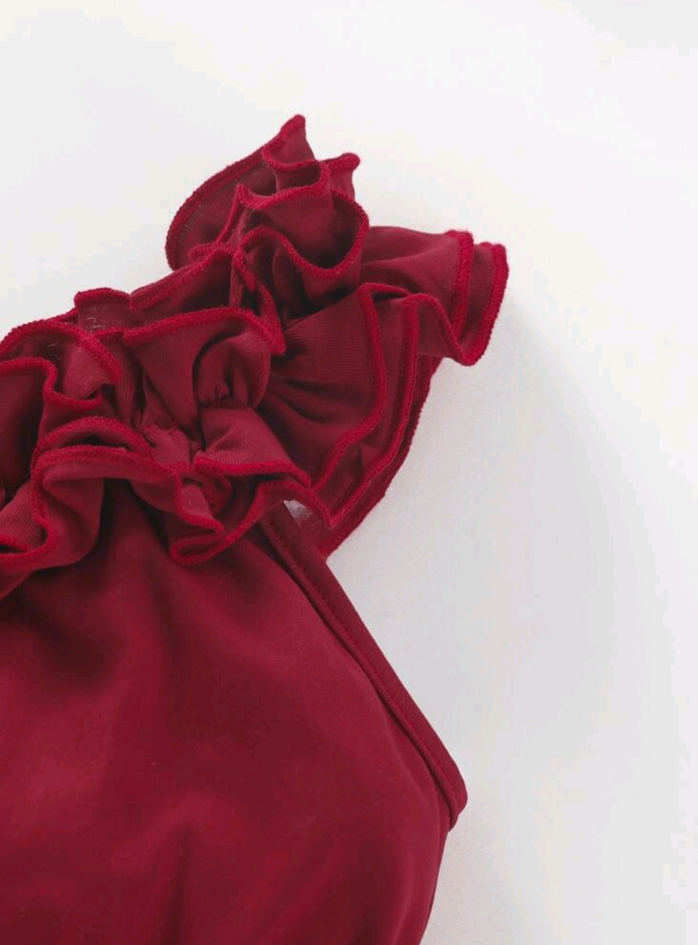 Asymmetrical Neck Ruffle Trim Belted Dress.